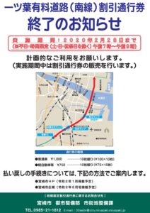 - 宮崎県道路公社は「(一ツ葉有料道路)北線の料金値下げを行い、料金徴収期間を延伸して、県出資金を含む未償還金全額を償還」する方針とし、4月より実施された[2]。